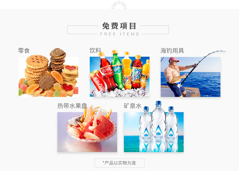 礦泉水、飲料、小吃、水果、魚竿魚餌、暈船貼 |
